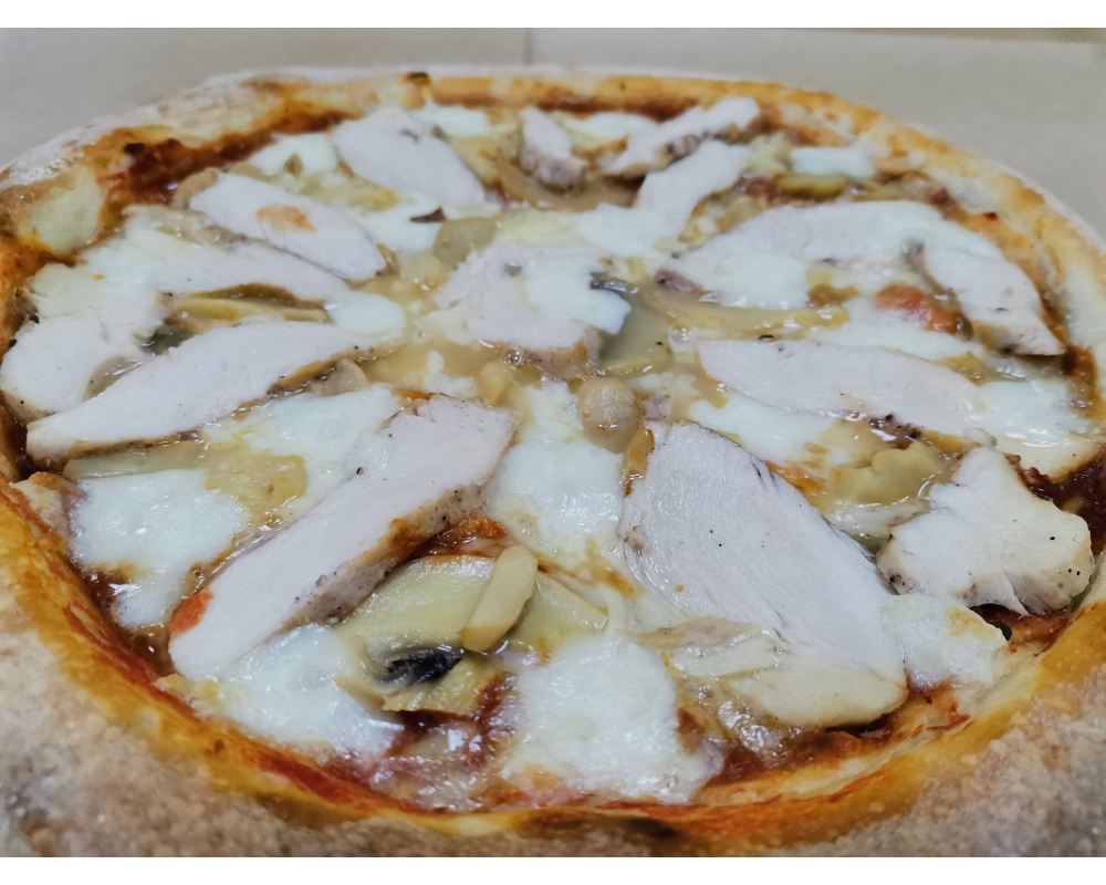 Состав: соус сливочный пикантный, соус чипотле, курица, грибы шампиньоны, каперсы, сыр моцарелла