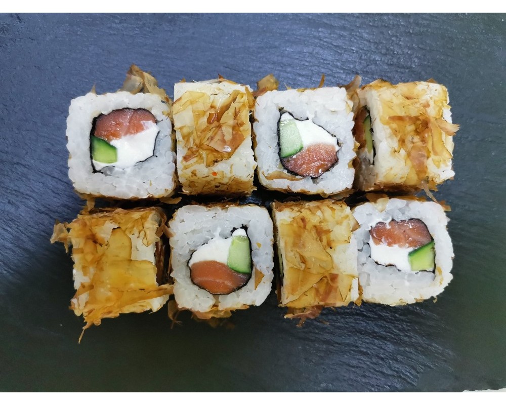 Состав: рис, водоросли нори, лосось копченый, огурец, сыр творожный, стружка бонито