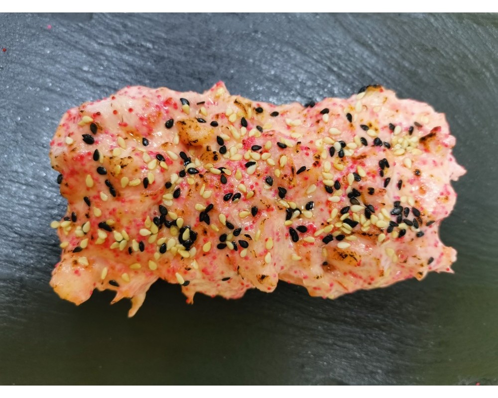 Состав: рис, водоросли нори, креветка, лосось, икра масага, пекинка, соус сырный, кунжут