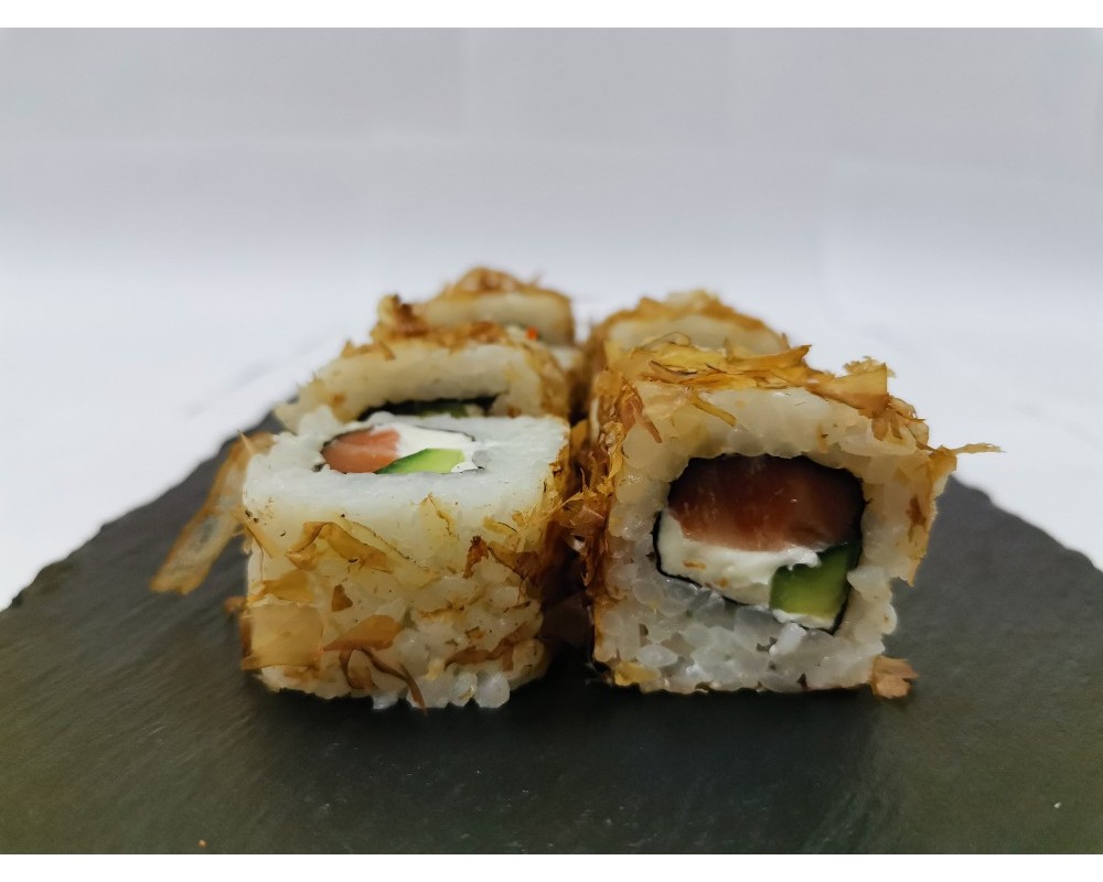 Состав: рис, водоросли нори, лосось копченый, огурец, сыр творожный, стружка бонито
