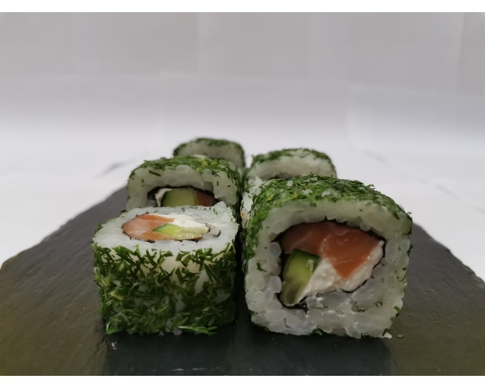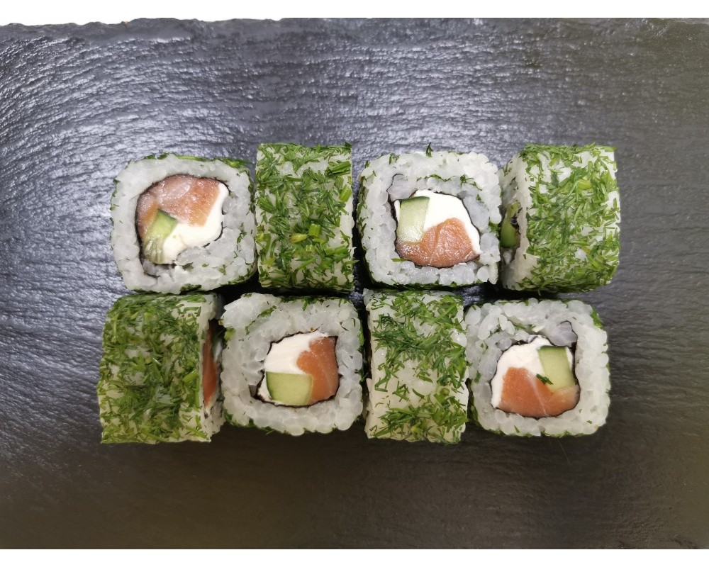 Состав: рис, водоросли нори, лосось копченый, огурец, сыр творожный, зелень